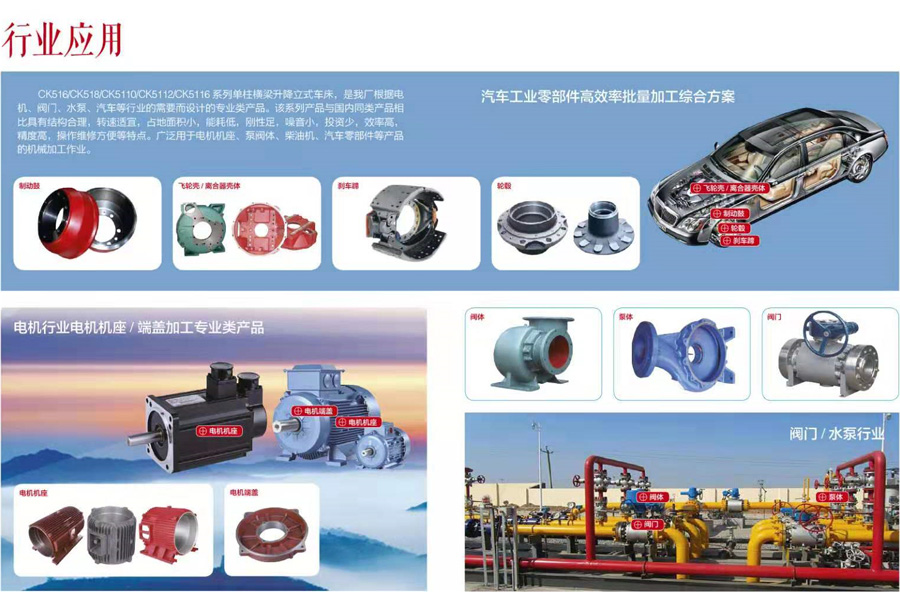 CK516/CK518/CK5110/CK5112/CK5116系列單柱橫梁升降立式車床,是我廠根據電機、閥門、水泵、汽車等行業(yè)的需要而設計的專業(yè)類產品。該系列產品具有結構合理,轉速適宜,占地面積小,能耗低,剛性足,噪音小,投資少,效率高,精度高,操作維修方便等特點。廣泛用于電機機座、泵閥體、柴油機、汽車零部件等產品的機械加工作業(yè)。